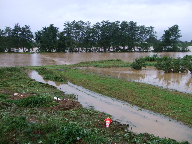 自宅の土手裏です。土手がなければ我が家も床下浸水していました。生まれてこの方初めてここまで水位が上昇しました。午前6時頃